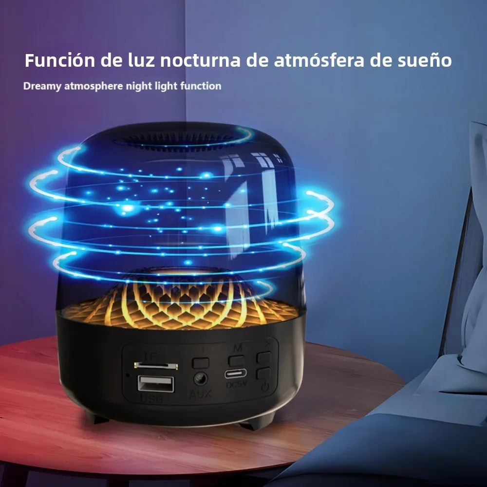 Eleva tu experiencia de audio y crea un ambiente de relajación con la Bocina Bluetooth "Glaze". Este altavoz no es solo un dispositivo de audio, sino también una función de luz nocturna de atmósfera de sueño (Dreamy atmosphere night light function). Con su diseño transparente y efectos de luz giratorios de color azul, es ideal para la mesita de noche o para ambientar cualquier espacio.