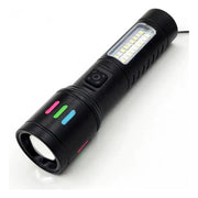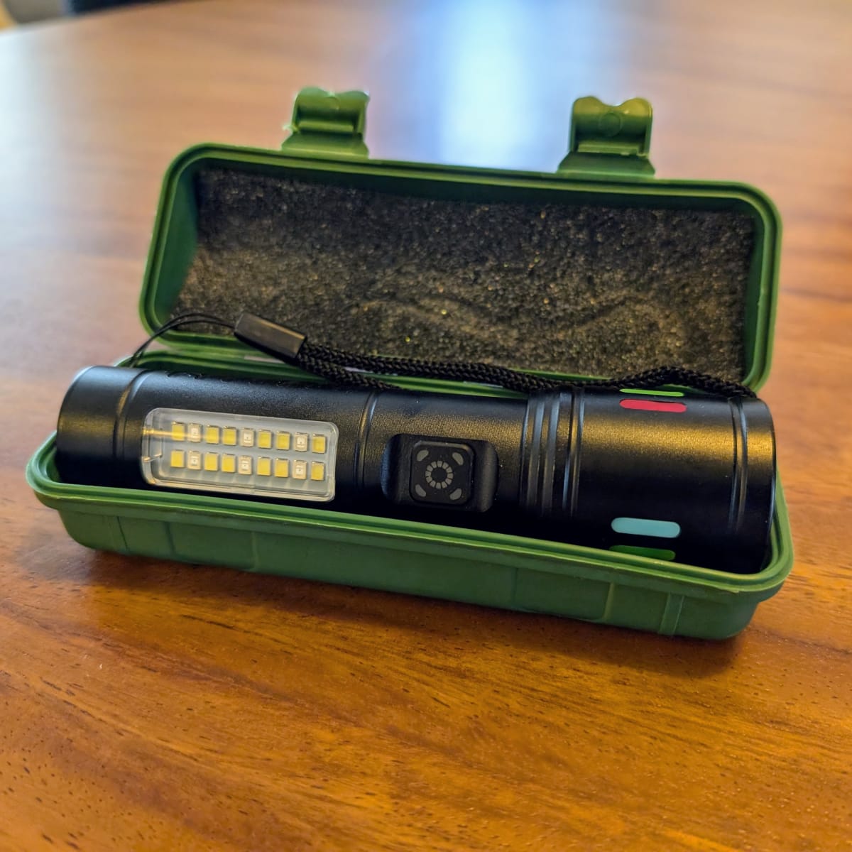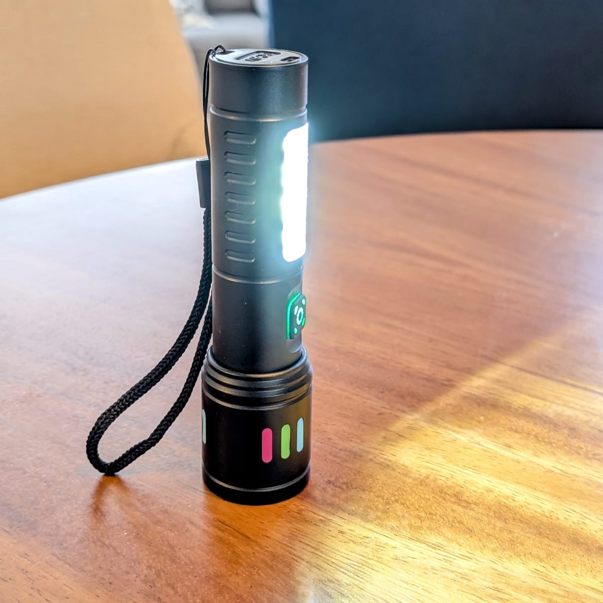 Material: Cuerpo de la linterna fabricado en aleación de aluminio (inferido por la textura y el color negro).