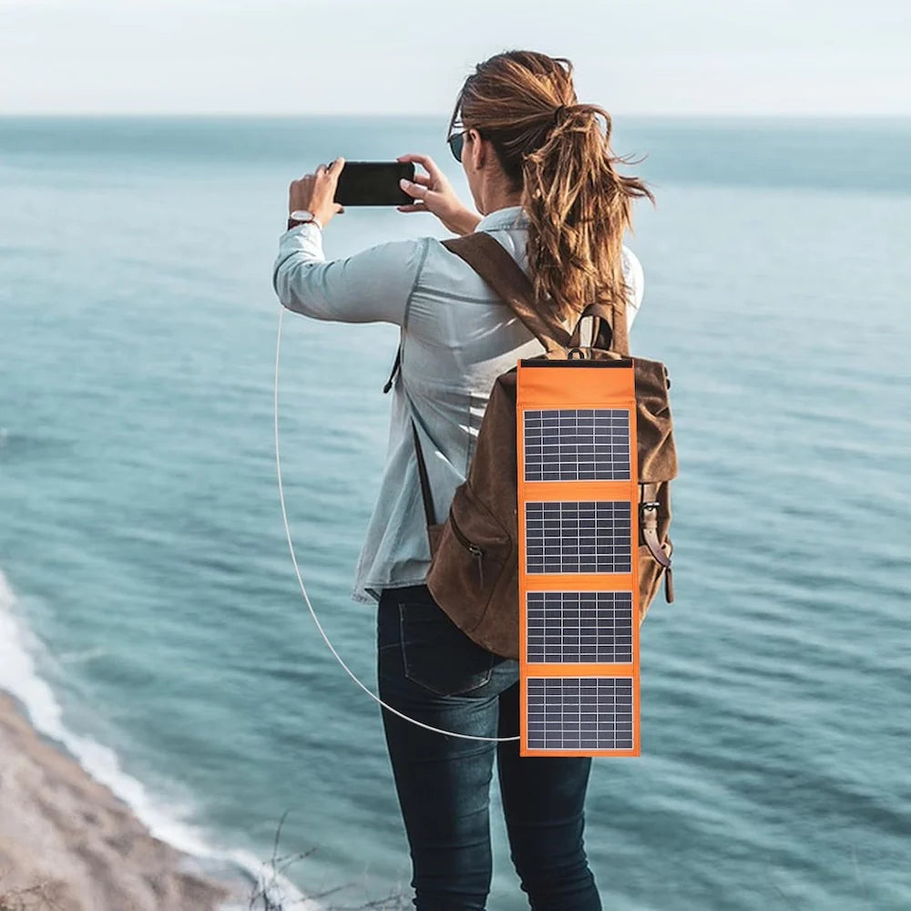 Este panel solar plegable de 20W es la mejor opción para cargar dispositivos electrónicos de manera ecológica y eficiente. Su diseño ligero y portátil permite transportarlo fácilmente en mochilas, ideal para camping, senderismo, viajes y emergencias. Con dos puertos USB, carga smartphones, tablets, cámaras y más.